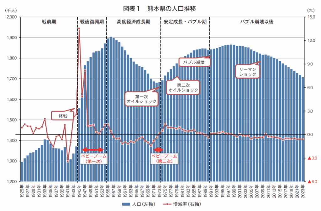 本稿では、第 3 回として熊本県の人口の変化に焦点を当てる。人口の変化は、地域の暮らしや経済活動に深く関わる重要なテーマである。そこで、自然増減(出生数・死亡数)、社会増減(転入・転出)、年齢構成という三つの観点から、戦前期から現代に至るまでの人口動態を整理・分析する。