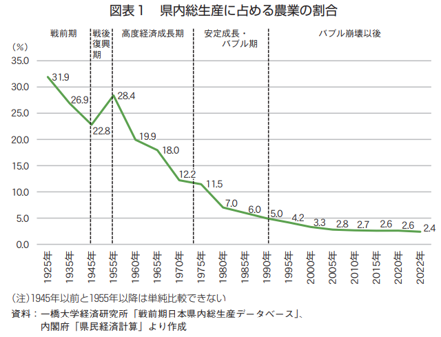 県内総生産額に占める農業の割合の推移をみると、1925年は31.9%を占めていた。産業の中心が製造業やサービス業にシフトする中で、1955年以
