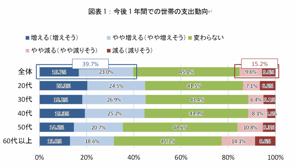まず、今後1年間での世帯の支出動向について尋ねた。全体では、「増える層」が39.7%、「変わらない」が45.1%、「減る層」が15.2%となった図表1)。年代が上がるにつれ、「増える層」が少なくなる傾向となった。