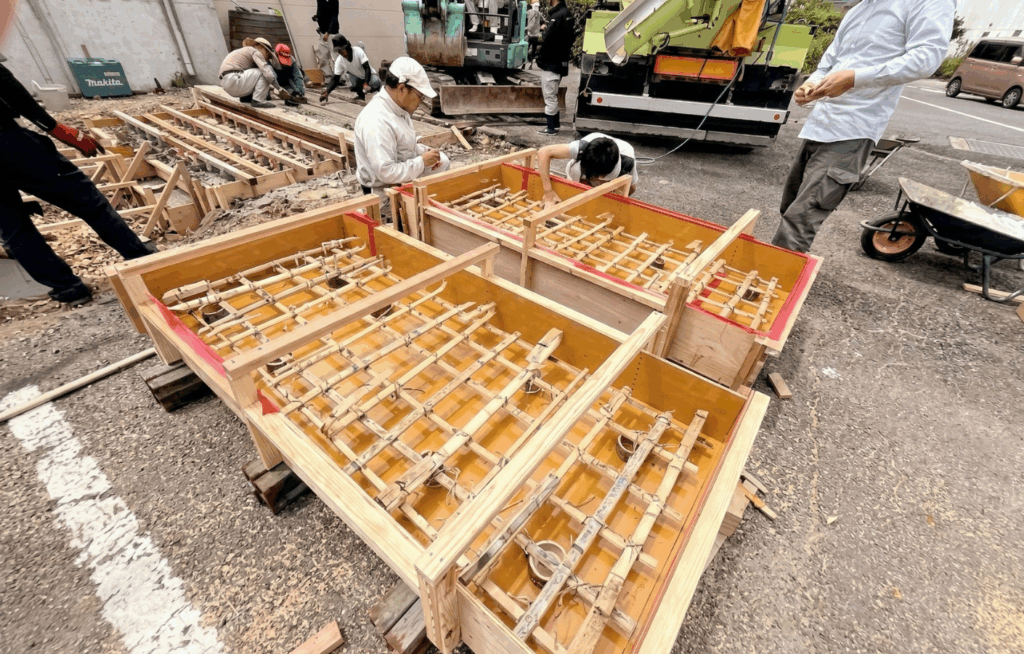 本プロジェクトでは、駐車場部分のコンクリート舗装の中に竹筋を埋めています。特に車が駐車できる橋梁部分に竹筋を使うことは挑戦的な取組みです。